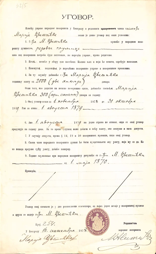 Збирку архивских докумената чине административна акта која се односе углавном на Народно позориште у Београду, документа везана за историју српског позоришта, лична документа глумаца, редитеља, оперских певача, диригената, композитора, балетских играча и осталих уметника. Грађу чине оригинали, уз минимални проценат копија/фотокопија. Највећи број докумената датира из друге половине XIX века (најстарији значајни документ је из 1851 – Акт Народног позоришта Попечитељству Просвешћенија у којем се тражи одобрење за подизање позоришне зграде), остала грађа је из периода до почетка Другог светског рата, док је веома мали број докумената из каснијег периода.