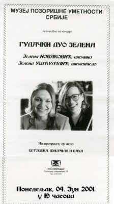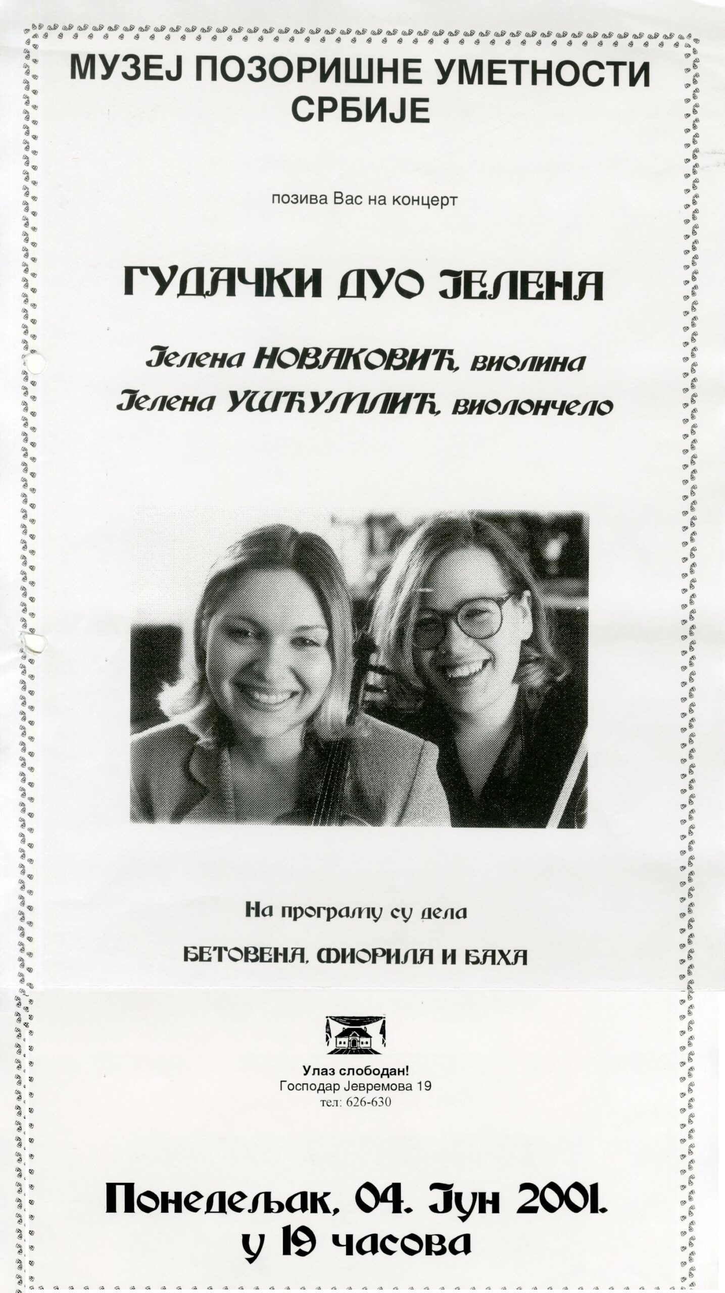 КонцертиГУДАЧКИ ДУО ЈЕЛЕНА јун 4, 2001фебруар 22, 2026 04 јун Понедељак, 04.јун 2001. у 19:00 сати Музеј позоришне уметности Србије позива Вас на концерт ГУДАЧКИ ДУО ЈЕЛЕНА Јелена НОВАКОВИЋ, виолина Јелена УШЋУМЛИЋ, виолончело На програму су дела Бетовена, Фиорила и Баха Улаз слободан. Добро дошли! ПРИКАЗИВАЧИ ВЕШТИНА ЦРНИ КЛАВИР