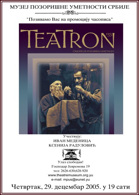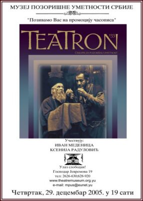 ПромоцијеТЕАТРОН 133 децембар 29, 2005фебруар 22, 2026 29 дец Четвртак, 29. децембар 2005. у 19:00 сати Учествују: Иван Меденица Ксенија Радуловић Улаз слободан. Добро дошли! ЈАСМИНА ЈАНКОВИЋ СТЕВАН СРЕМАЦ НА СРПСКИМ ПОЗОРИШНИМ СЦЕНАМА