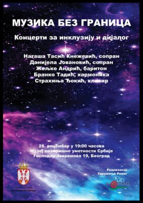 КонцертиМузика без граница децембар 28, 2023фебруар 22, 2026 28 дец Концерти за инклузију и дијалог Учествују: Наташа Тасић Кнежевић, сопран Данијела Јовановић, сопран Жељко Андрић, баритон Бранко Тадић, хармоника Страхиња Ђокић, клавир Четвртак, 28. децембар 2023. у 19 часова Концерт студената клавира Концерт студената клавира ФМУ