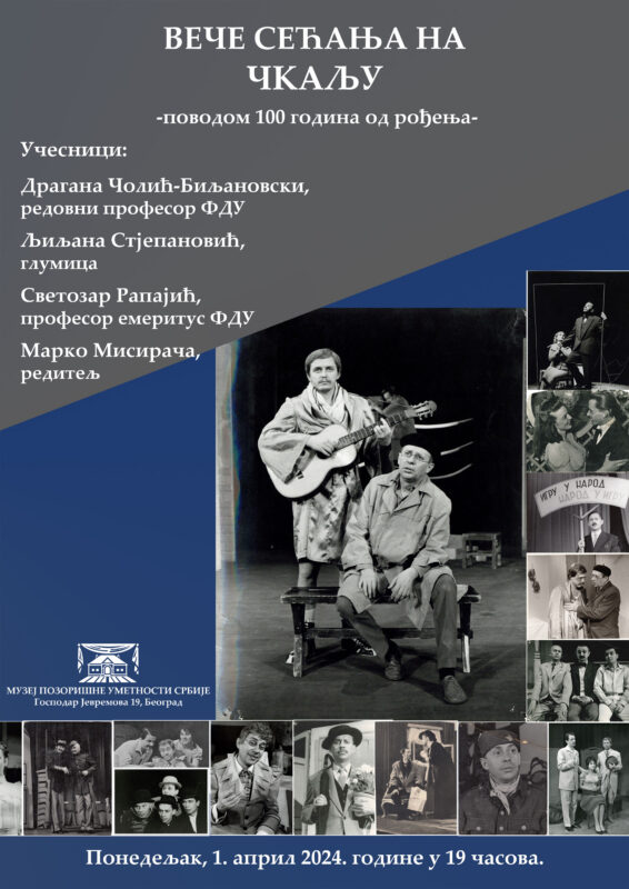 Вече сећања на Миодрага Петровића Чкаљу поводом сто година од рођења Учесници: Драгана Чолић Биљановски, професорка ФДУ Љиљана Степановић, глумица Светозар Рапајић, професор емеритус ФДУ Марко Мисирача, редитељ Понедељак, 1. април 2024. у 19 сати погледајте снимак вечери