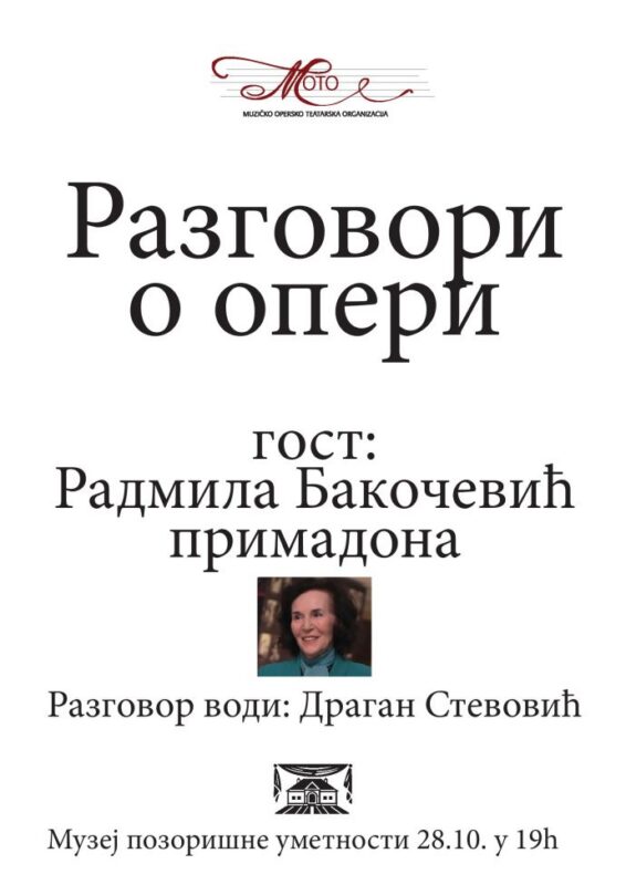 Љубитеље оперске уметности позивамо на својеврсно путовање кроз време, на које ће нас у Музеју позоришне уметности Србије водити Драган Стевовић. Гост примадона Радмила Бакочевић. Циклус је наставак успешне сарадње са Музичко-оперско-театарском организацијом МОТО, у оквиру пројекта „Opera: Past, Present, Perfect!“.