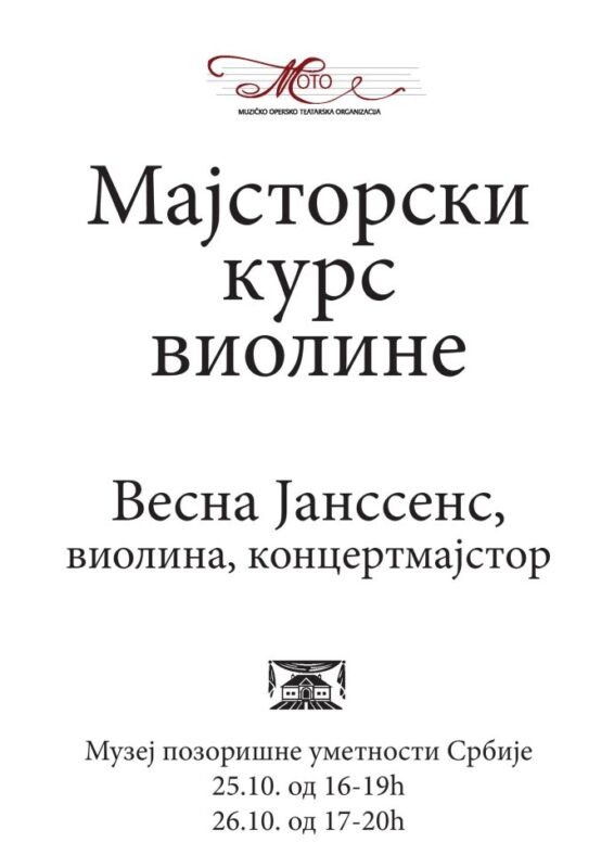Још један пројекат у оквиру успешне сарадње са Музичко-оперско-театарском организацијом МОТО. Мајсторске радионице „Оперска литература за гудаче“ Весне Јансенс, концертмајстора Оркестра Оперe и Театра „Мадленианум“ и стални гостујући концертмајстор Оркестра Опере Народног позоришта у Београду. Уторак, 25. октобар од 16 до 19 часова Среда, 26. октобар од 17 до 20 часова