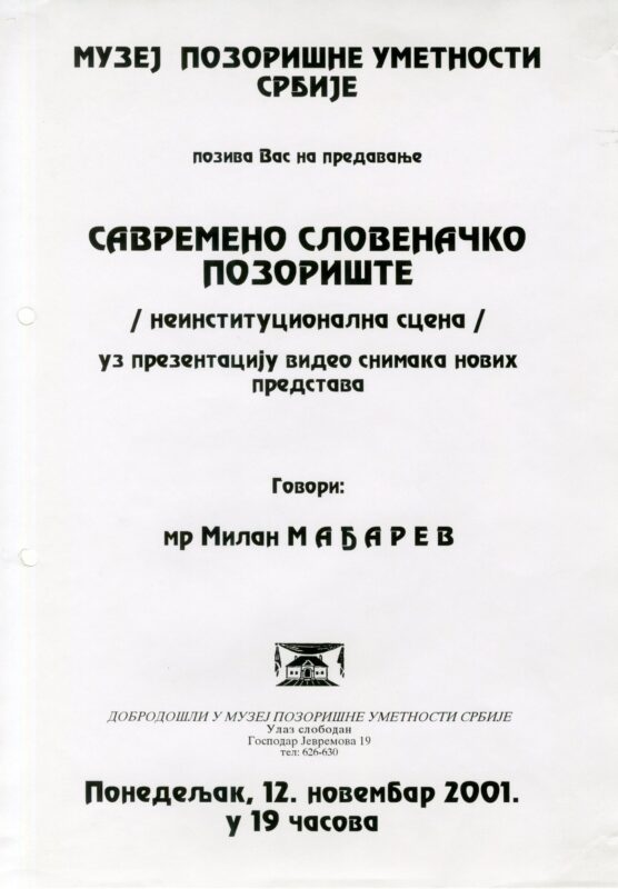 Понедељак, 12. новембар 2001. у 19:00 сати Музеј позоришне уметности Вас позива на предавање САВРЕМЕНО СЛОВЕНАЧКО ПОЗОРИШТЕ неинституционална сцена (уз презентацију видео снимака нових представа) Говори: Милан Мађарев Улаз слободан. Добро дошли!